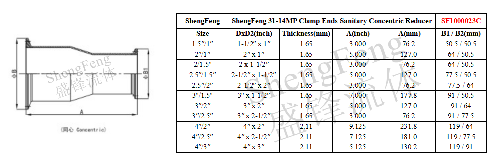 ShengFeng 31-14MP Clamp Ends Sanitary Concentric Reducer